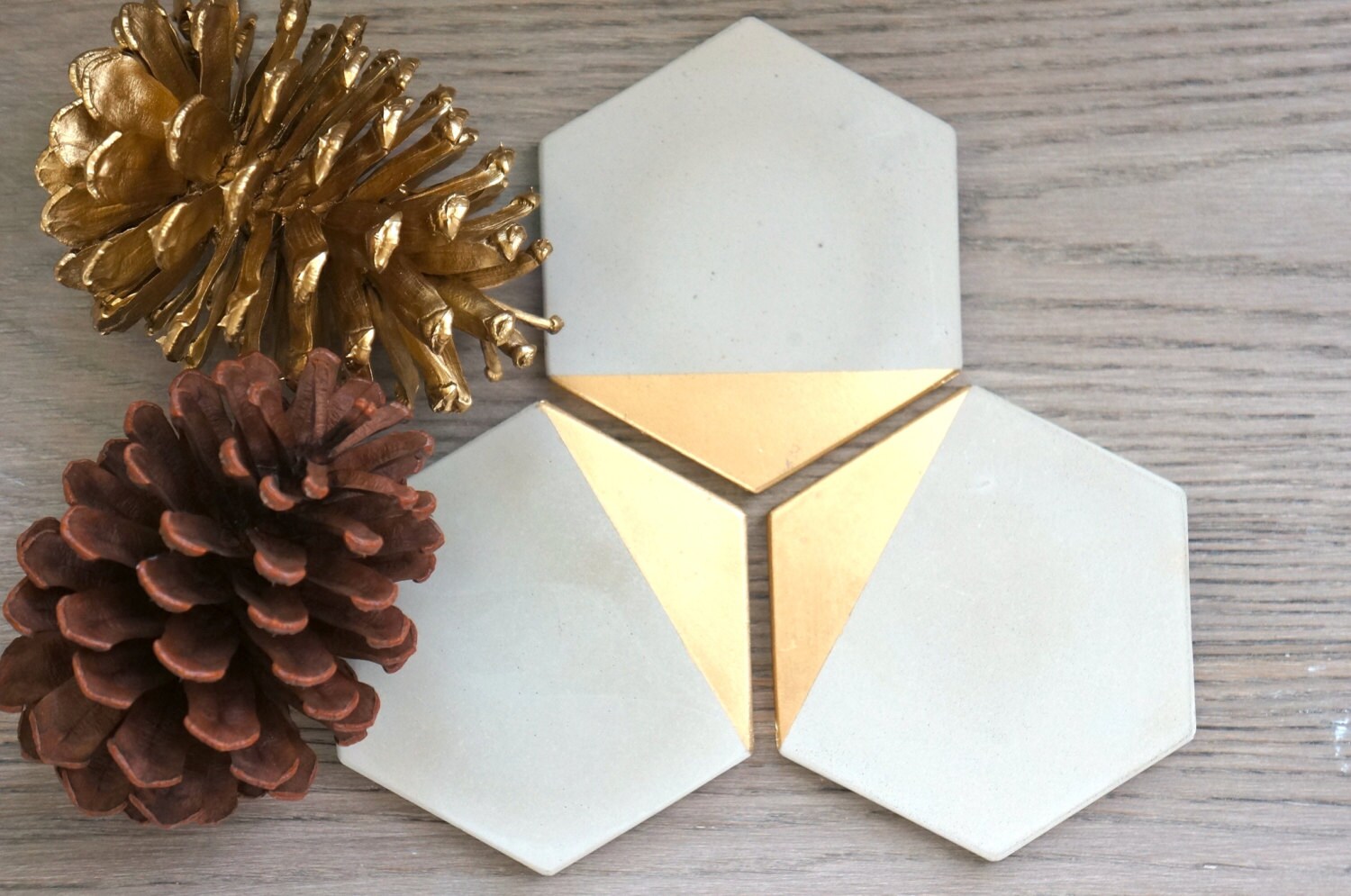 18+ Painted Concrete Coasters Background. Set comes with cork pads to protect furniture surfaces. Black hexagonal concrete coasters with gold painted on a single edge create the perfect 4.